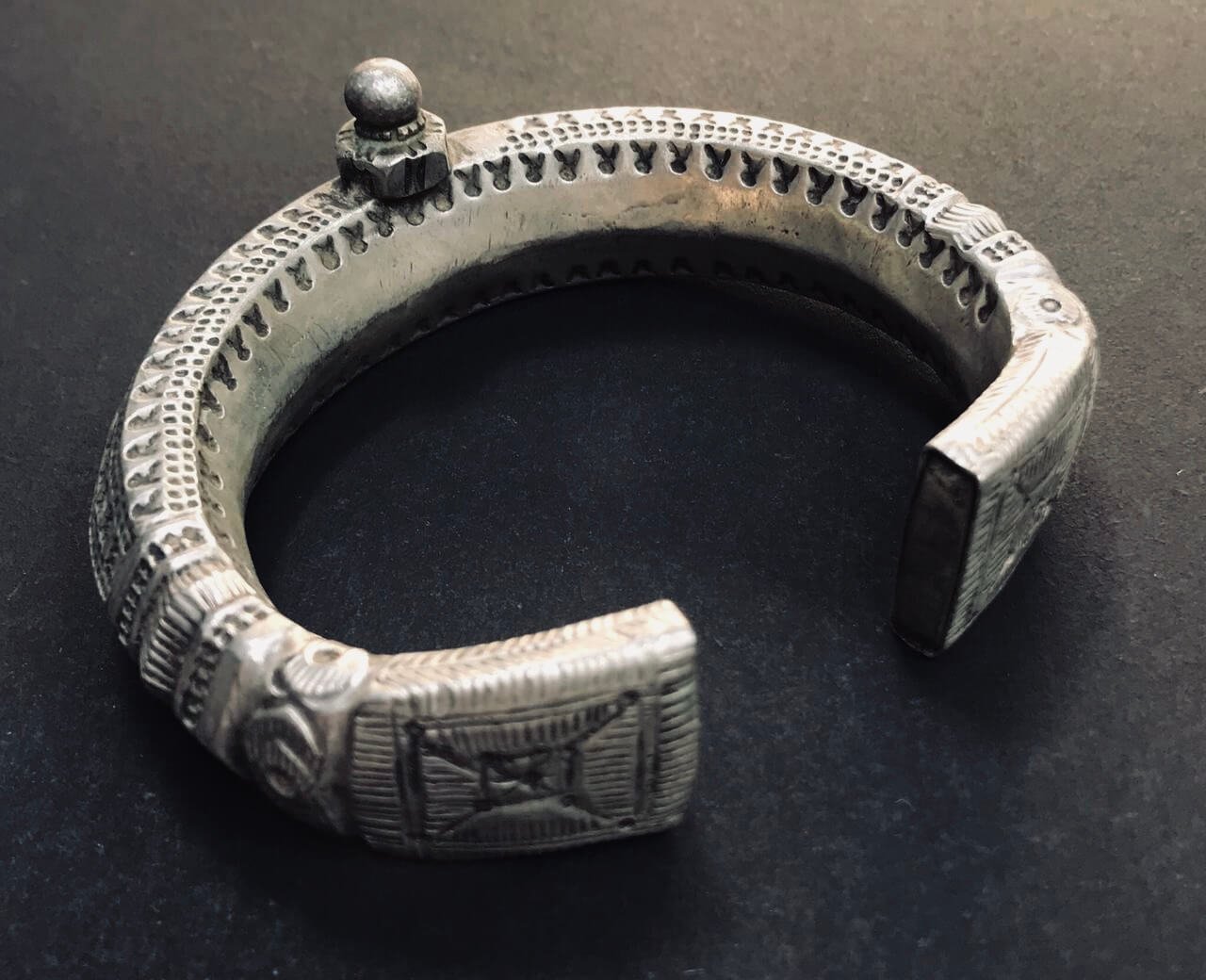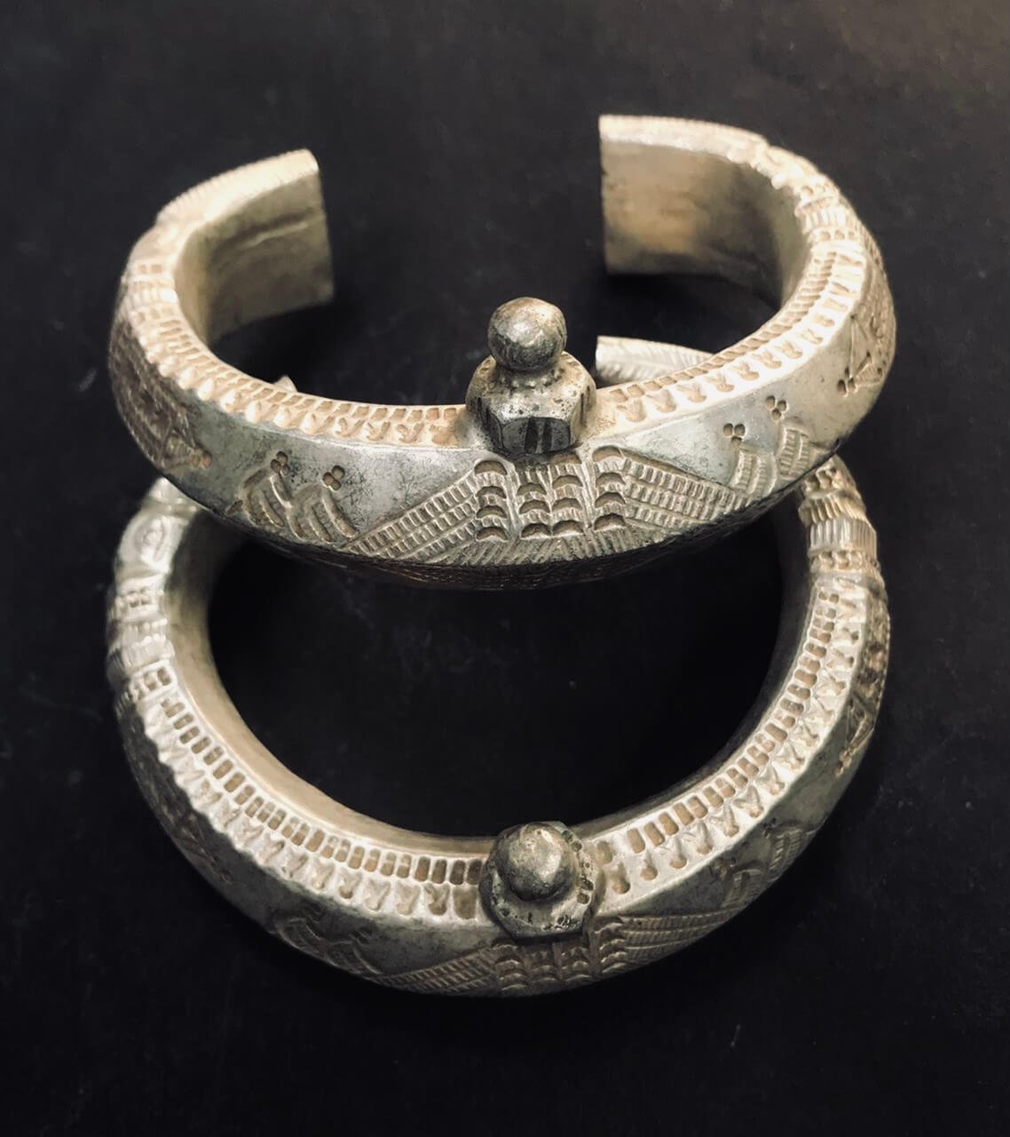 This antique high grade silver pair bracelet was handmade in the beginning of the last Century. It have some beautiful engravings which originally covered the bracelet all over. This beautiful piece was made of solid silver and have a nice handmade design on it. It opens up on the side to put them easily.